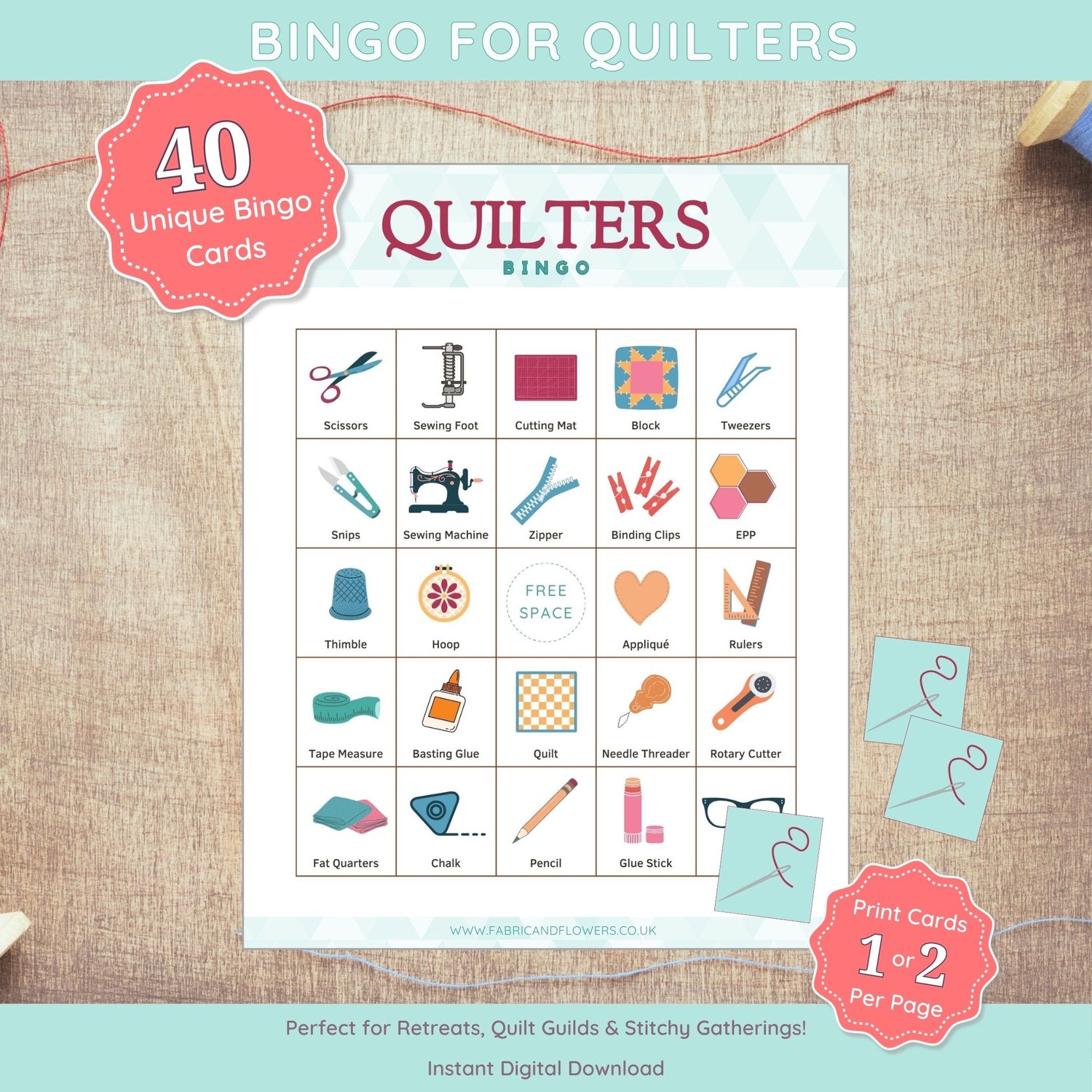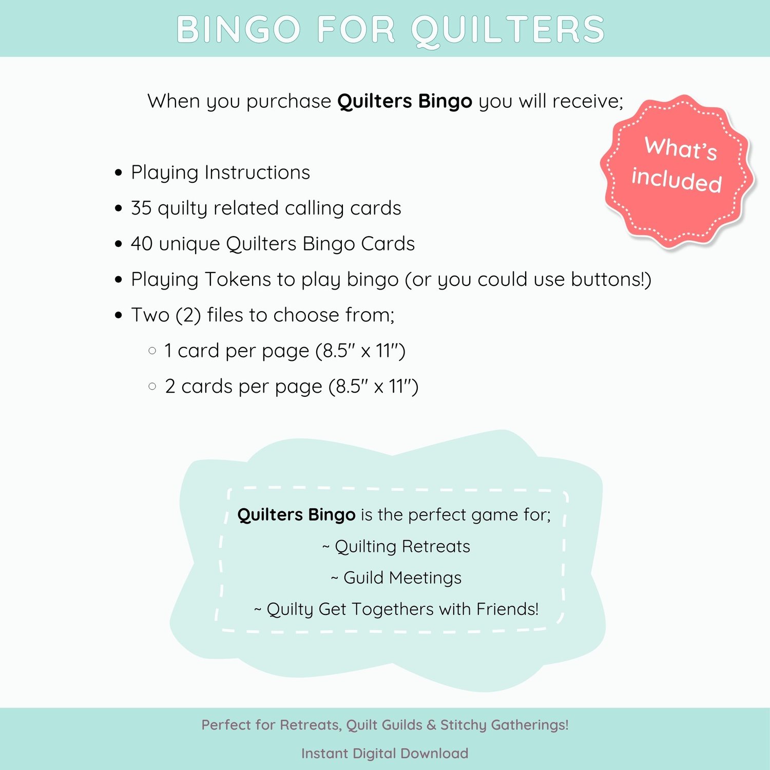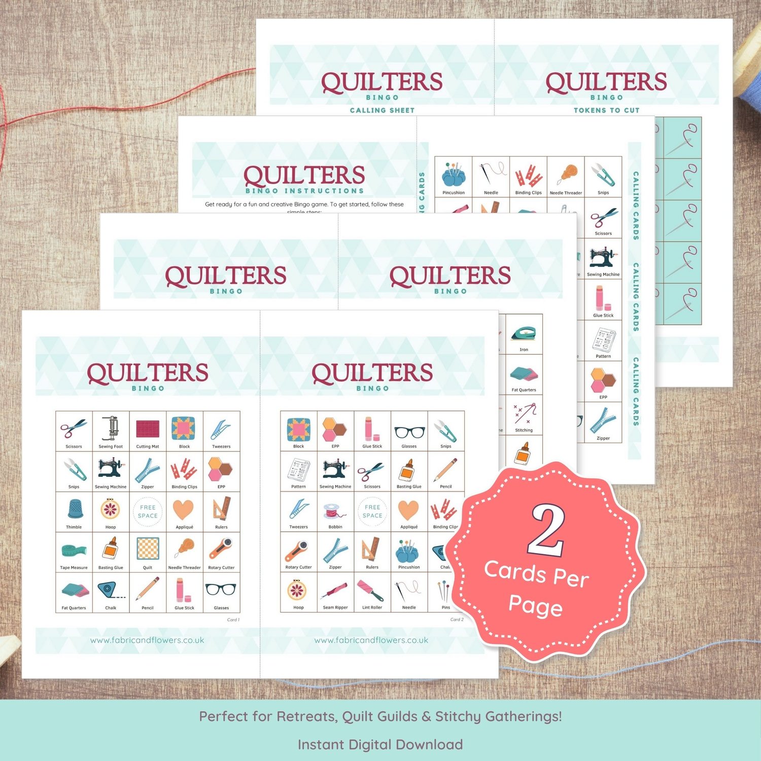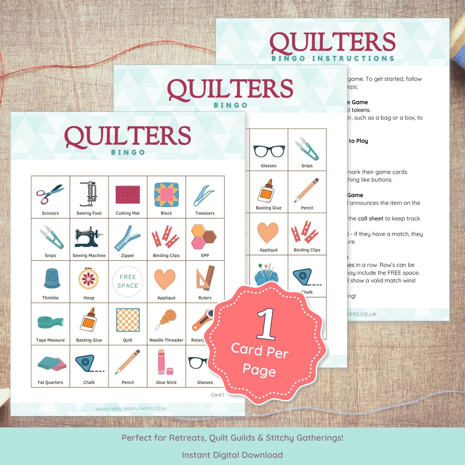 This Quilters’ Bingo set includes: